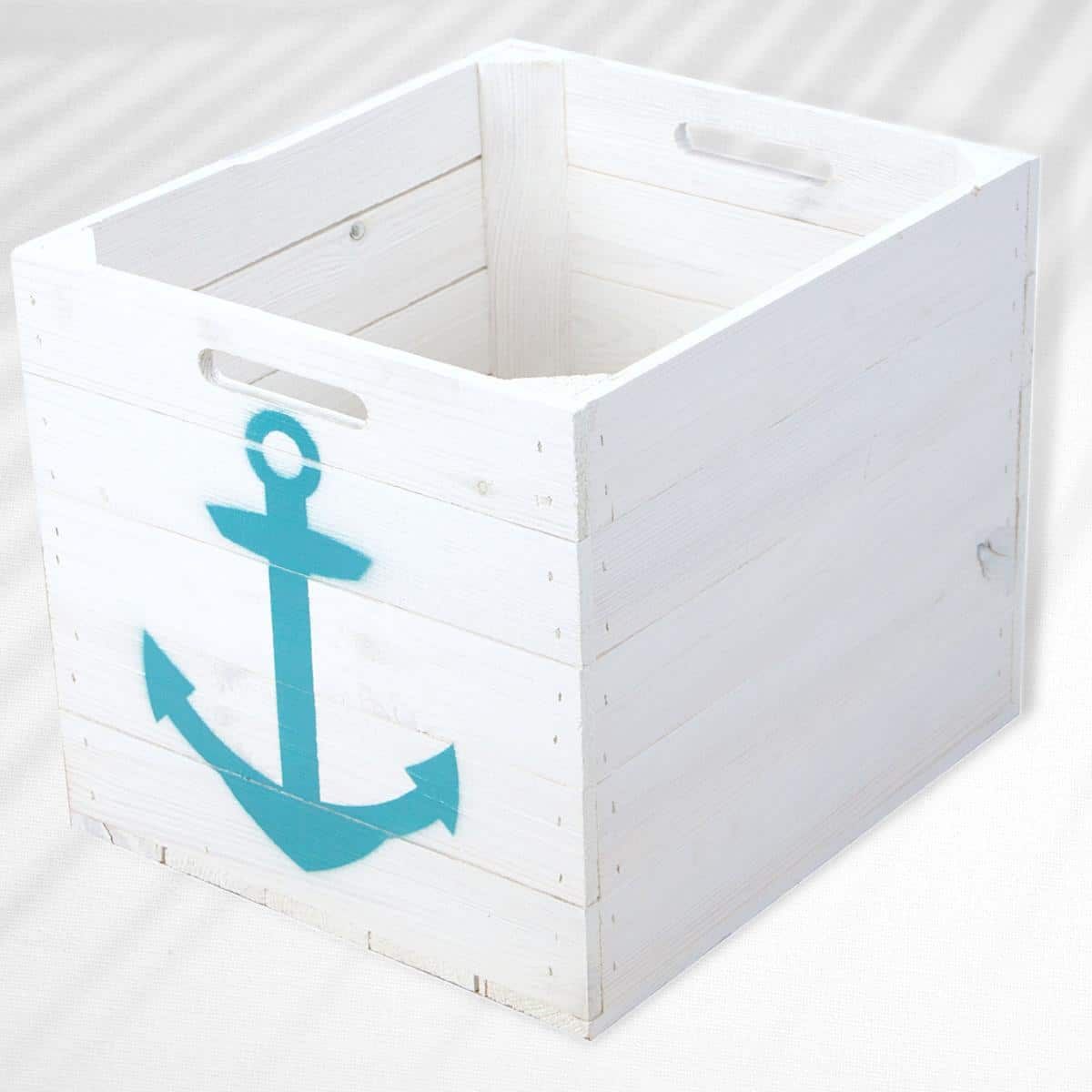 Holzkiste Kallax in weiß mit einem türkisem Anker Aufdruck. Die Kallax Kisten passen in alle Ikea Kallax – Expeditregale.