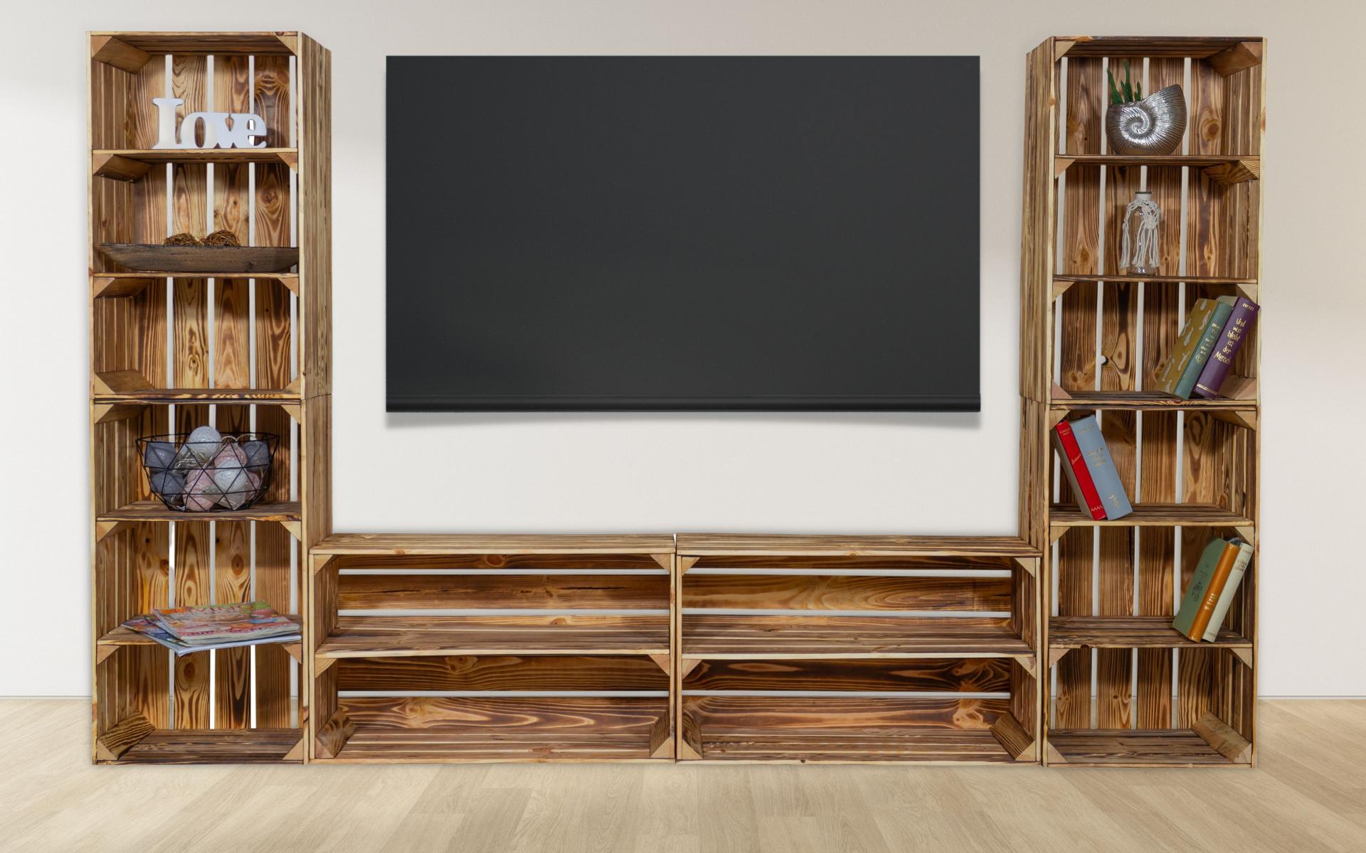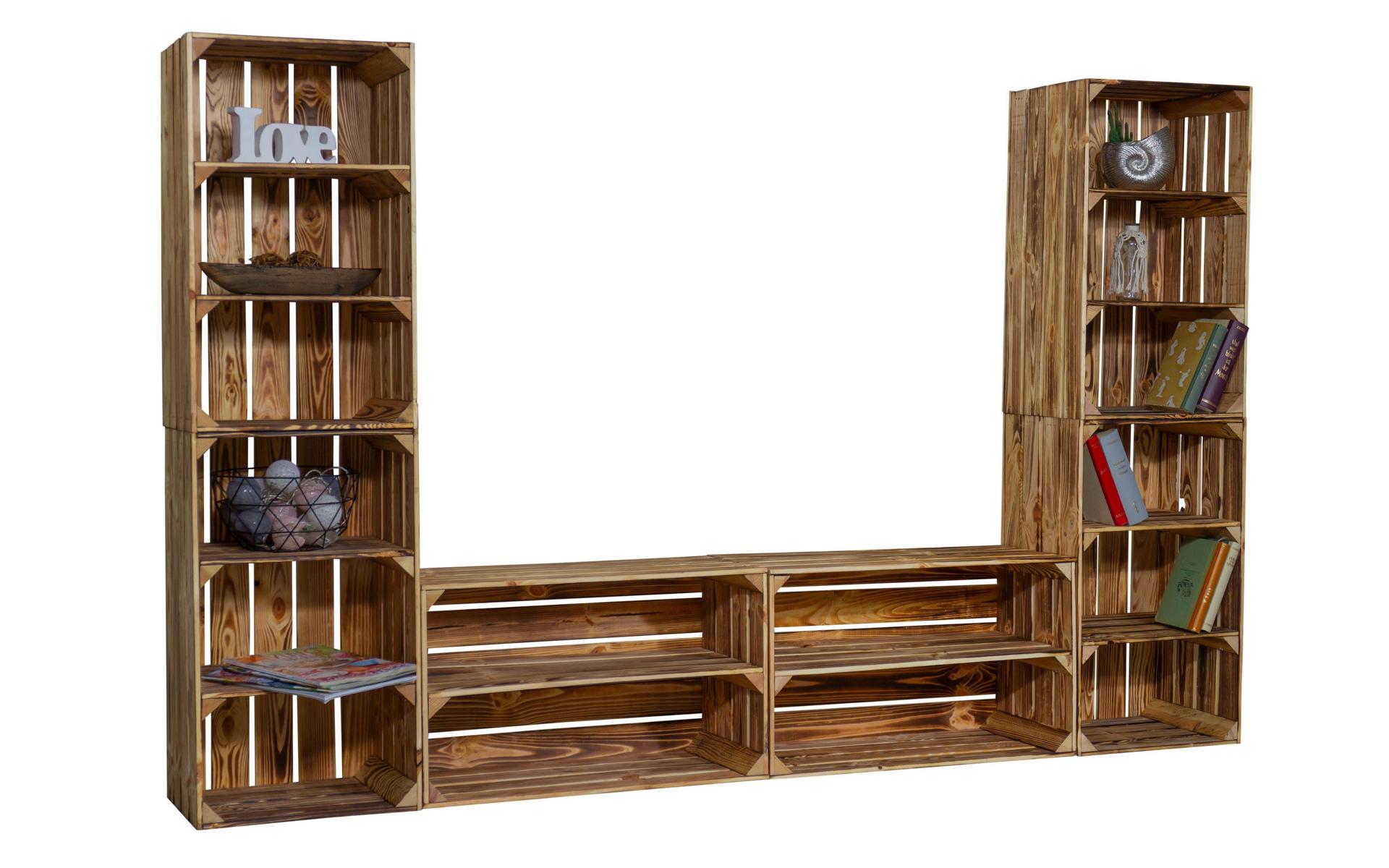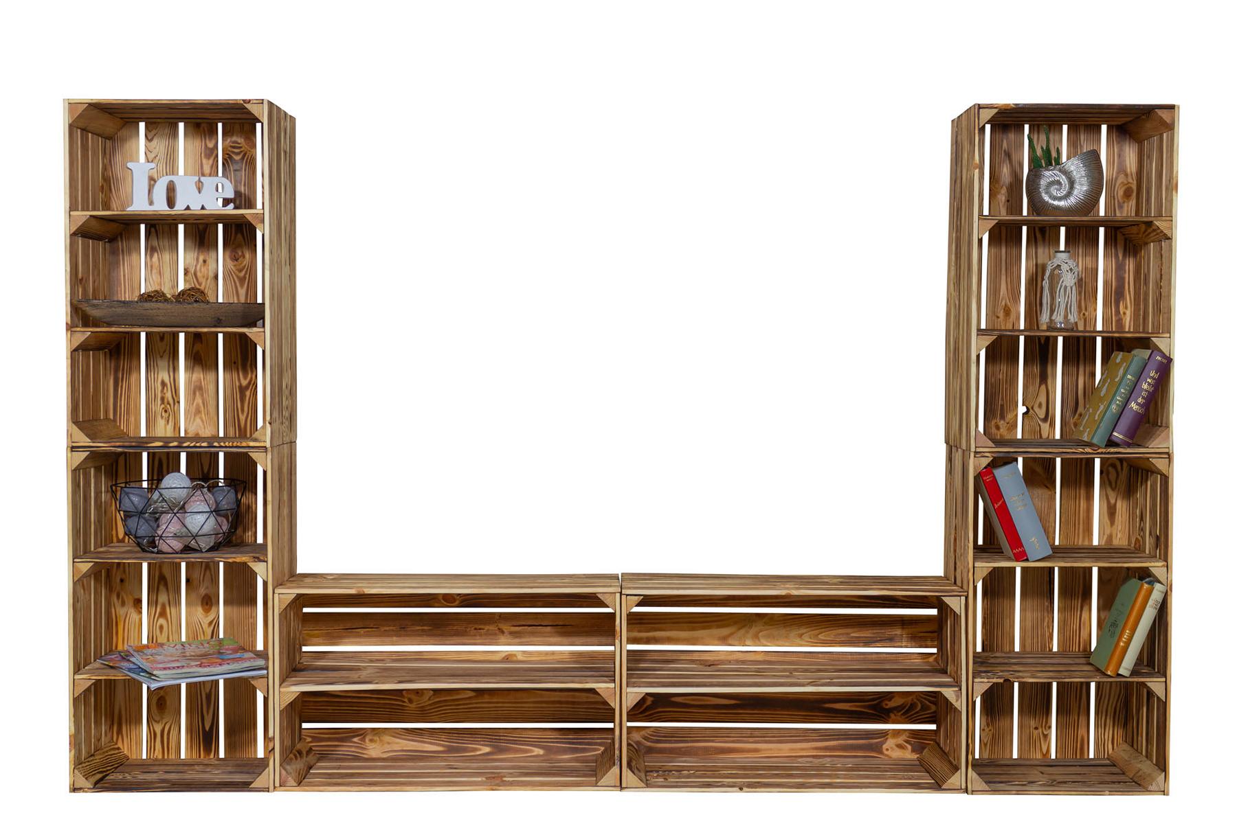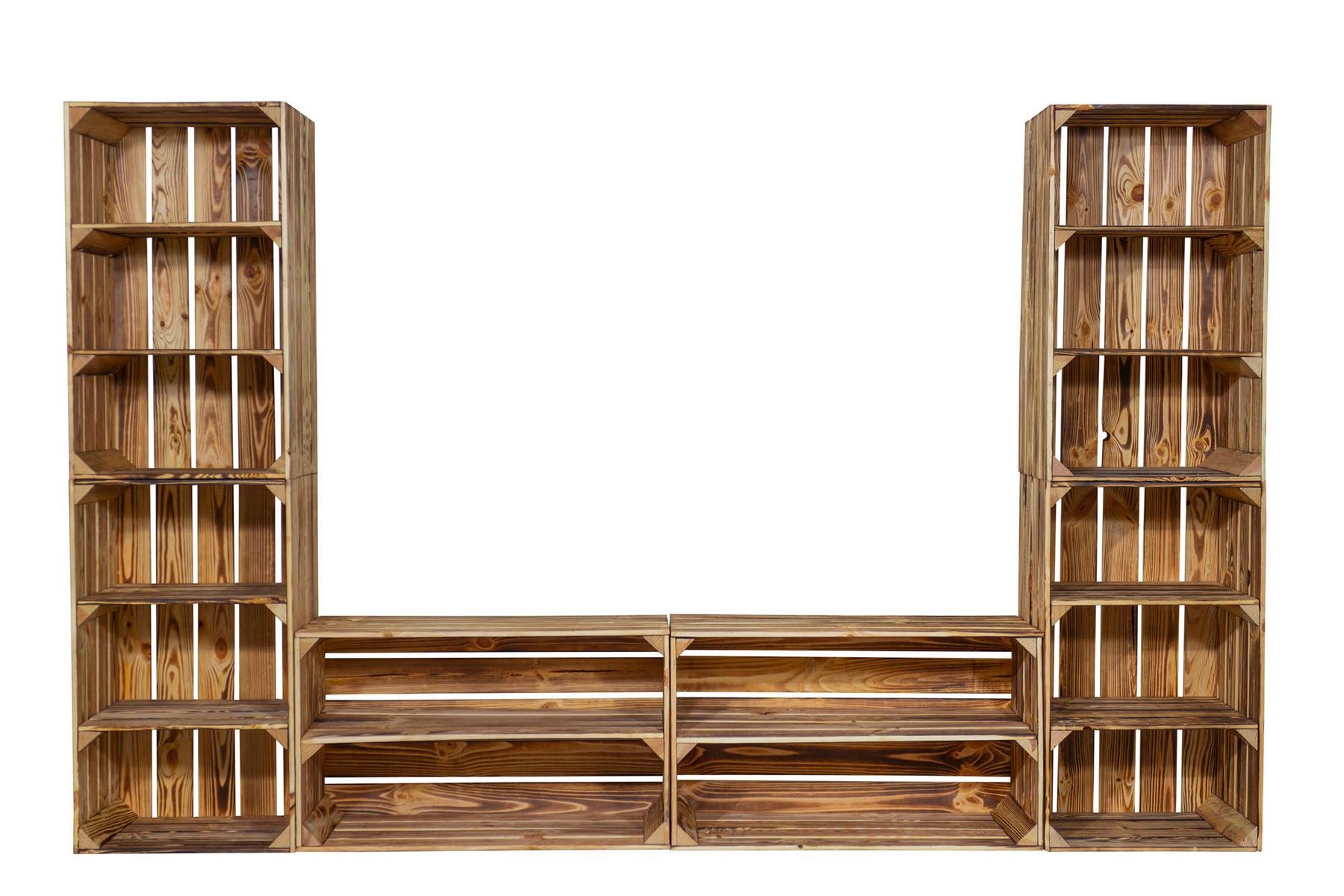 Holzkisten Regal Möbel set aus neuen geflammten Obstkisten & Weinkisten. Geeignet als Wohnwand – Wandregal – TV-Board – Wohnzimmer Regal für TV – Hifi Geräte und Deko. Ganz individuell einsetzbar.