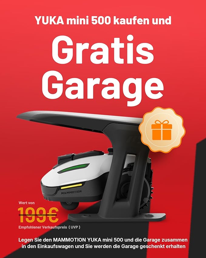 - Wichtiger Hinweis: Der YUKA Mini 500 Mähroboter und die Garage werden separat geliefert. Bitte legen Sie die Garage beim Bestellen mit in den Warenkorb und schließen Sie die Bestellung gemeinsam ab. Der Aktionsrabatt wird beim Bezahlen automatisch angewendet. Wenn Sie Fragen haben, kontaktieren Sie uns bitte jederzeit.