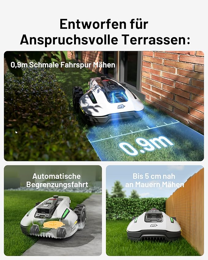 - Die stärkste RWD-Geländetauglichkeit: Angetrieben durch das robuste Motorsystem und die übergroßen Geländeräder erklimmt der YUKA mini mühelos Steigungen von bis zu 50% und überwindet vertikale Hindernisse von bis zu 3,5 cm Höhe. Sein 88-Watt-Mähmotor ist perfekt geeignet, um eine breite Palette von Grasarten mit Leichtigkeit zu bearbeiten.