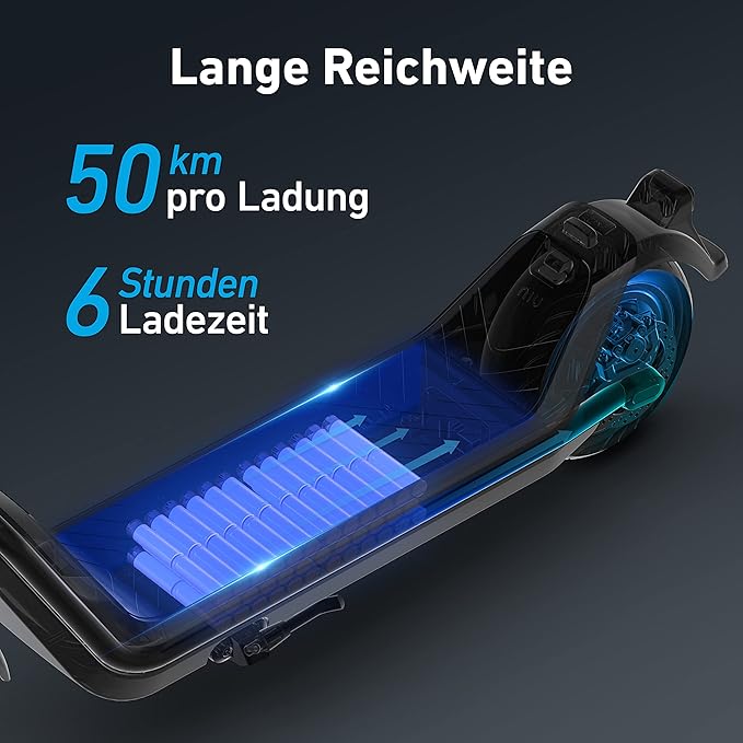 • Reichweite von bis zu 50km (variiert abhängig von Farhweise, Reifenluftdruck, Straßengegebenheiten, Körpergröße & -gewicht, Außentemperatur), Akku voll aufladbar in ca. 6h